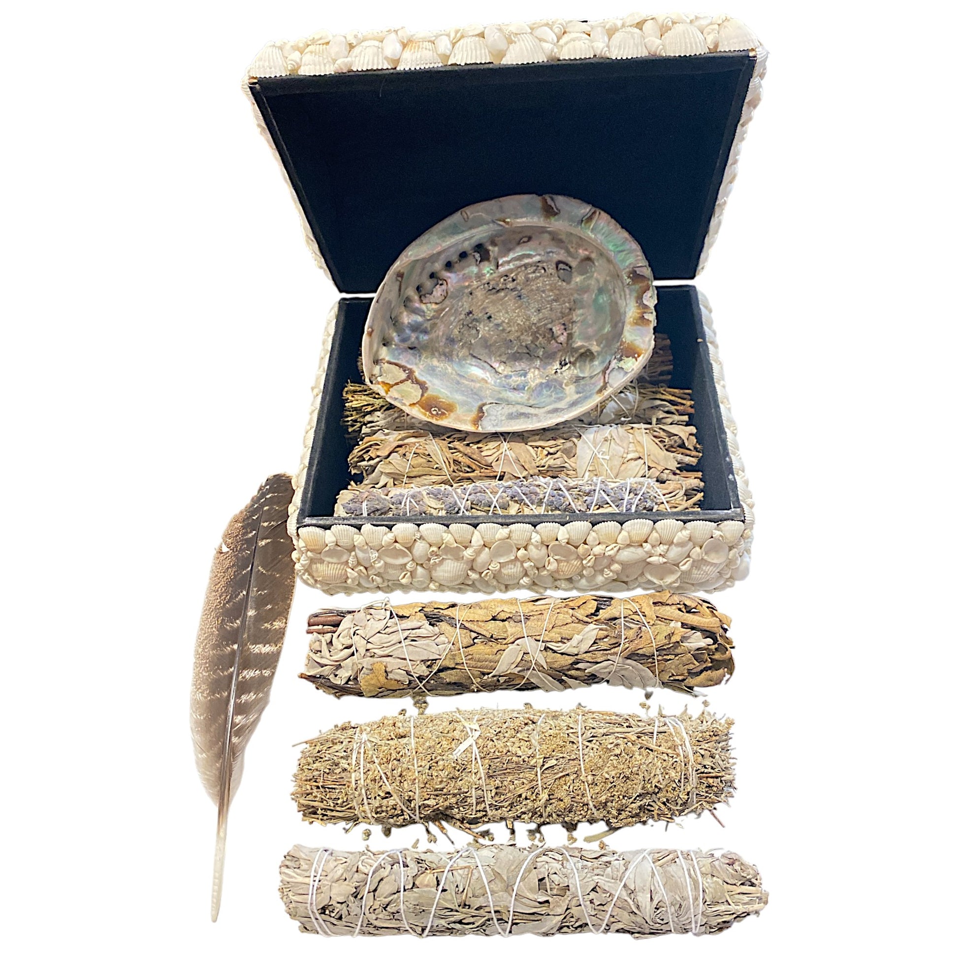 The Chief's Ultra Deluxe Smudge Kit in a handmade white seashell chest.